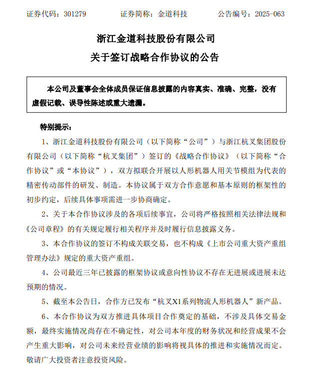 10月29日,金道科技(301279.SZ)公告称,公司与杭叉集团签订《战略合作协议》,双方拟联合开展以人形机器人用关节模组为代表的精密传动部件的研发、制造。通过本协议的签署,双方深化开展战略协同,共同开拓项目创新,有利于提升杭叉集团相关业务的市场竞争力,支持对方机器人业务布局的同时,也可以增强公司服务机器人行业客户的能力,从而实现双方互利共赢,互相支撑对方做强、做优、做大各自的优势业务。