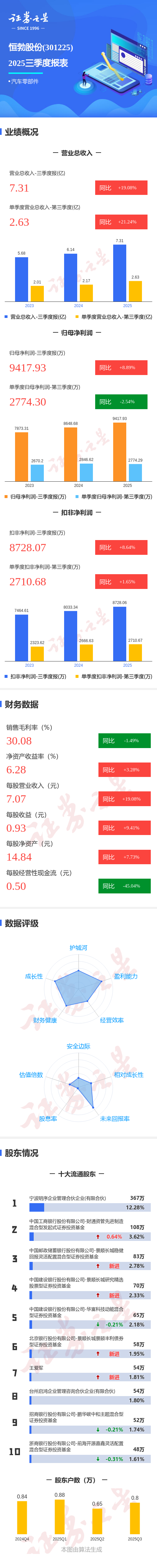证券之星消息,恒勃股份2025年三季报显示,前三季度公司主营收入7.31亿元,同比上升19.09%;归母净利润9417.93万元,同比上升8.89%;扣非净利润8728.07万元,同比上升8.65%;其中2025年第三季度,公司单季度主营收入2.63亿元,同比上升21.25%;单季度归母净利润2774.3万元,同比下降2.54%;单季度扣非净利润2710.68万元,同比上升1.65%;负债率22.92%,投资收益300.36万元,财务费用-119.39万元,毛利率30.08%。