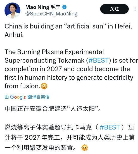 最近,外交部发言人毛宁,在海外社交平台上分享了一条让世界物理学界都大为震撼的计划——中国“人造太阳”,即将在2027年完工。