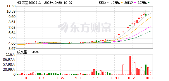 *ST东易再度涨停,18个交易日内录得13个涨停,累计涨幅为109.67%,累计换手率为126.28%。截至9:40,该股今日成交量896.66万股,成交金额9569.89万元,换手率2.18%。最新A股总市值达45.48亿元,A股流通市值44.61亿元。