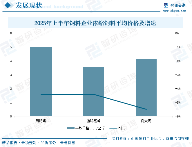 从平均价格来看,2025年上半年饲料企业浓缩饲料平均价格同比呈现下降趋势,其中育肥猪饲料平均价格为5元/公斤,同比下降4.4%;蛋鸡高峰饲料平均价格为3.54元/公斤,同比下降4.4%;肉大鸡饲料平均价格为4.13元/公斤,同比下降5.5%。