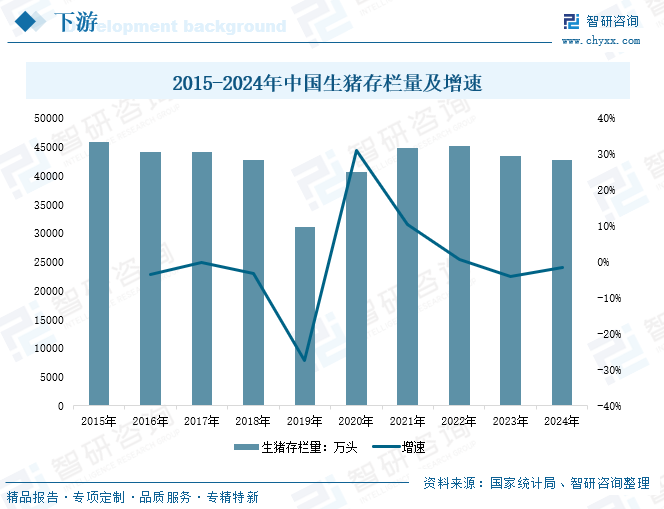 在粮食安全战略与消费升级需求的双重驱动下,中国生猪养殖行业正经历着从传统散养向现代集约化生产的深刻变革。作为农业产业链的核心环节,生猪养殖不仅承载着保障肉类供给安全的使命,更成为推动农业现代化、促进乡村振兴的重要抓手。自改革开放以来,我国生猪养殖行业受经济持续高速增长、城乡居民收入水平不断提高和食物消费结构不断升级等因素的需求强力拉动。根据国家统计局数据,2015-2024年中国生猪存栏量呈现上下波动的态势,2024年中国生猪存栏量达到42742.9万头,同比下降1.56%,这主要受政策调控影响,2024年年初生猪产能过剩,市场主体主动控制母猪存栏量,散户在长期亏损压力下逐渐退出市场。而浓缩饲料行业发展与生猪养殖行业息息相关,随着生猪存栏量的下降,浓缩饲料行业需求也会疲软。