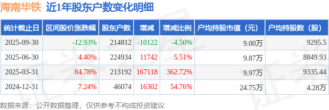 证券之星消息,近日海南华铁(维权)披露,截至2025年9月30日公司股东户数为21.48万户,较6月30日减少1.01万户,减幅为4.5%。户均持股数量由上期的8850.0股增加至9296.0股,户均持股市值为9.0万元。
