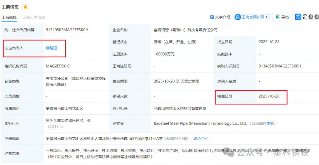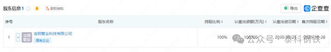 宝钢管业科技有限公司成立于2023年5月19日,由宝山钢铁股份有限公司与内蒙古包钢钢联股份有限公司共同投资设立,致力于推动国内钢管行业高质量发展。公司注册资本为61.85亿元,宝钢股份持股74.91%,包钢股份持股25.09%。成立后,公司以约10亿元现金收购包钢钢管19.20%股权,最终持有其49%股权,旨在打造无缝钢管领域的专业化领航企业。2024年底,宝钢管业科技有限公司发生工商变更,原股东包钢股份退出,注册资本由约62.4亿人民币减至约35.9亿人民币,目前由宝山钢铁股份有限公司100%控股,截至2025年10月,公司法定代表人由郭小龙担任。