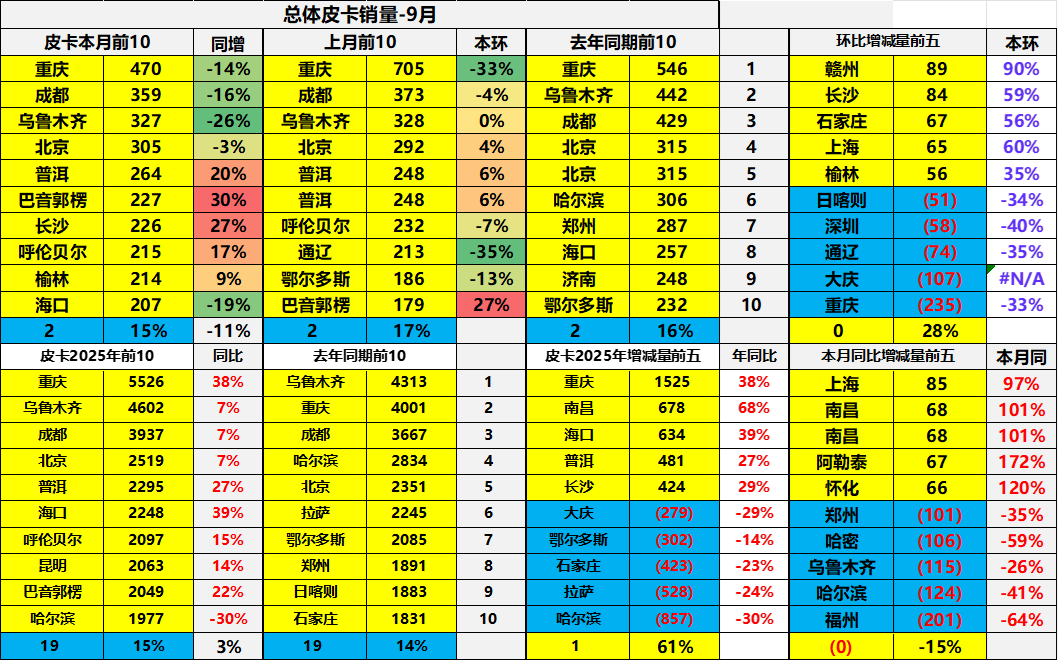 9月全国皮卡主力城市是重庆、成都、深圳、乌鲁木齐、北京和普洱等城市较强。尤其是随着电动皮卡推出,深圳等东部大城市的新能源皮卡需求表现较强。
