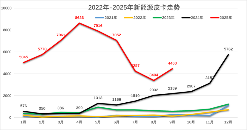 2025年皮卡批发市场走势前低中高,相对于历年的春节较早,因此2025年2-3月的皮卡走势获得增量,4-9月的皮卡销量逐步下滑。