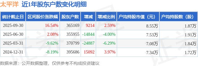 从股价来看,2025年6月30日至2025年9月30日,太平洋区间涨幅为16.54%,在此期间股东户数增加9214.0户,增幅为2.59%。
