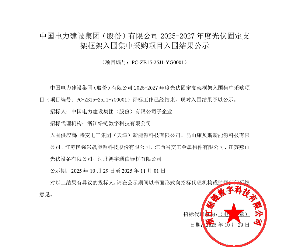 10月29日,中国电建公示2025-2027年度光伏固定支架框架入围集中采购项目中标结果,总规模为60GW。