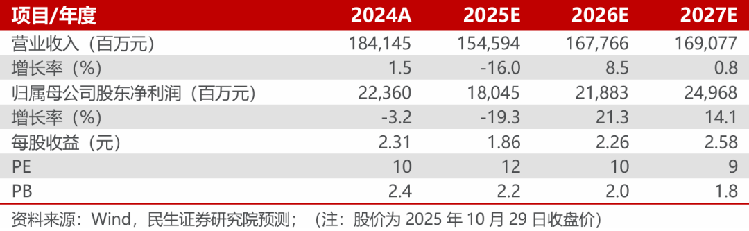 我们预计2025-2027年公司归母净利为180.45/218.83/249.68亿元,对应EPS分别为1.86/2.26/2.58元,对应2025年10月29日收盘价的PE分别为12/10/9倍。公司低负债,高现金,历史维持较高分红比例,维持“推荐”评级。