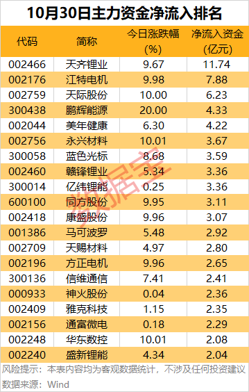 个股方面,天齐锂业尾盘主力资金净流入1.27亿元;福龙马、中国太保、中锐股份、赣能股份尾盘主力资金净流入均超4000万元。