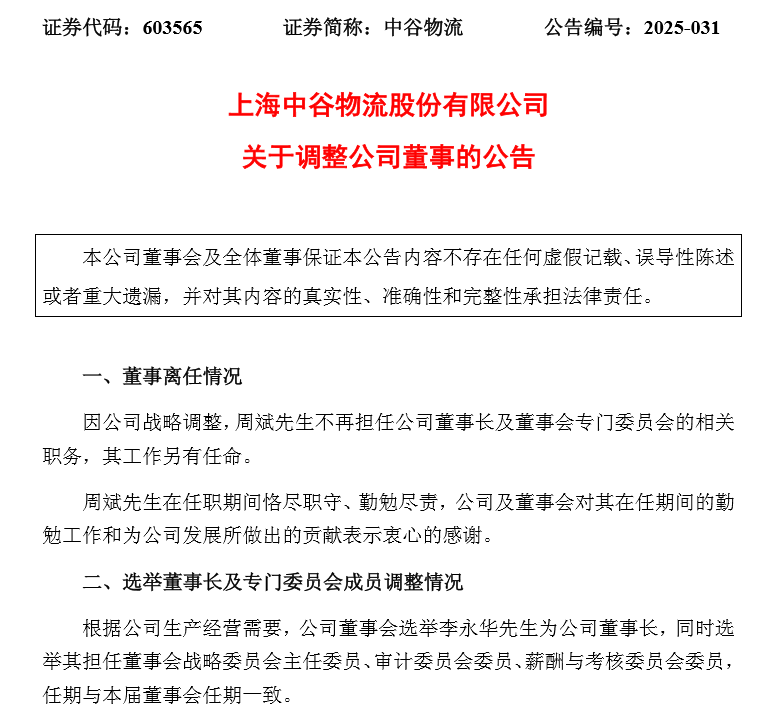 10月30日晚间,上海中谷物流股份有限公司(以下简称“中谷物流”或“公司”)发布关于公司董事长变动的公告。