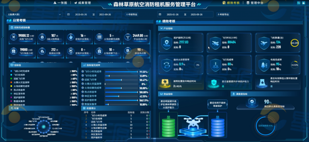 依据广西森林航空消防无人机租赁服务绩效考核标准,平台可自动统计巡护面积、时长等数据,生成日常及年度绩效考核表,并对异常数据进行智能校验,确保考评结果的科学性与公正性。