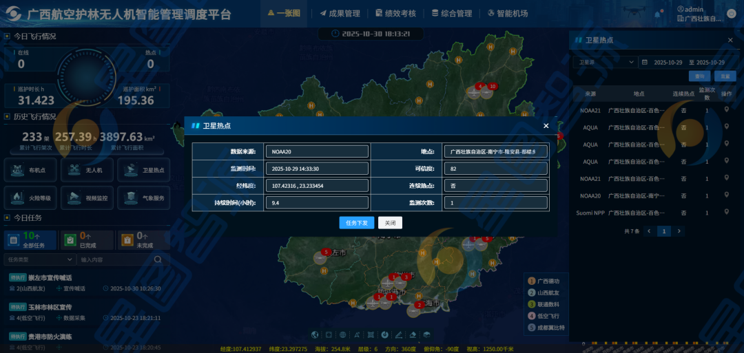 平台对接广西“智慧林火”卫星监测系统,支持自动接收热点信息并就近下发核查任务,实现“卫星发现、无人机核查”的高效联动。