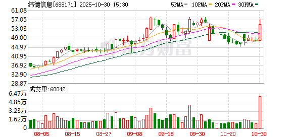 10月30日纬德信息(688171)收盘价54.88元,收盘上涨15.10%,全天换手率7.17%,振幅19.98%,成交额3.27亿元。科创板交易公开信息显示,当日该股因日收盘价涨幅达15%等上榜。