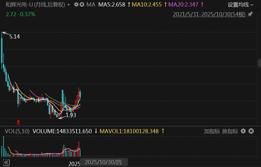 截至2025年10月30日收市,和辉光电在科创板的股价为2.72元,总市值约376亿元。