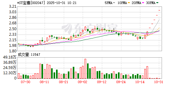 *ST宝鹰盘中涨停,已连收5个涨停板,截至9:26,该股报3.08元,换手率0.02%,成交量26.76万股,成交金额82.42万元,涨停板封单金额为1.69亿元。连续涨停期间,该股累计上涨27.80%,累计换手率为0.37%。最新A股总市值达46.70亿元,A股流通市值46.70亿元。