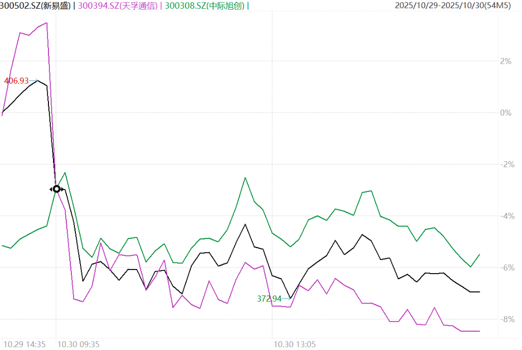 财报后10月30日新易盛与天孚通信股价分别重挫7.9%和11.56%。相比之下,营收、净利双双实现环比增长的中际旭创当日跌幅较窄。