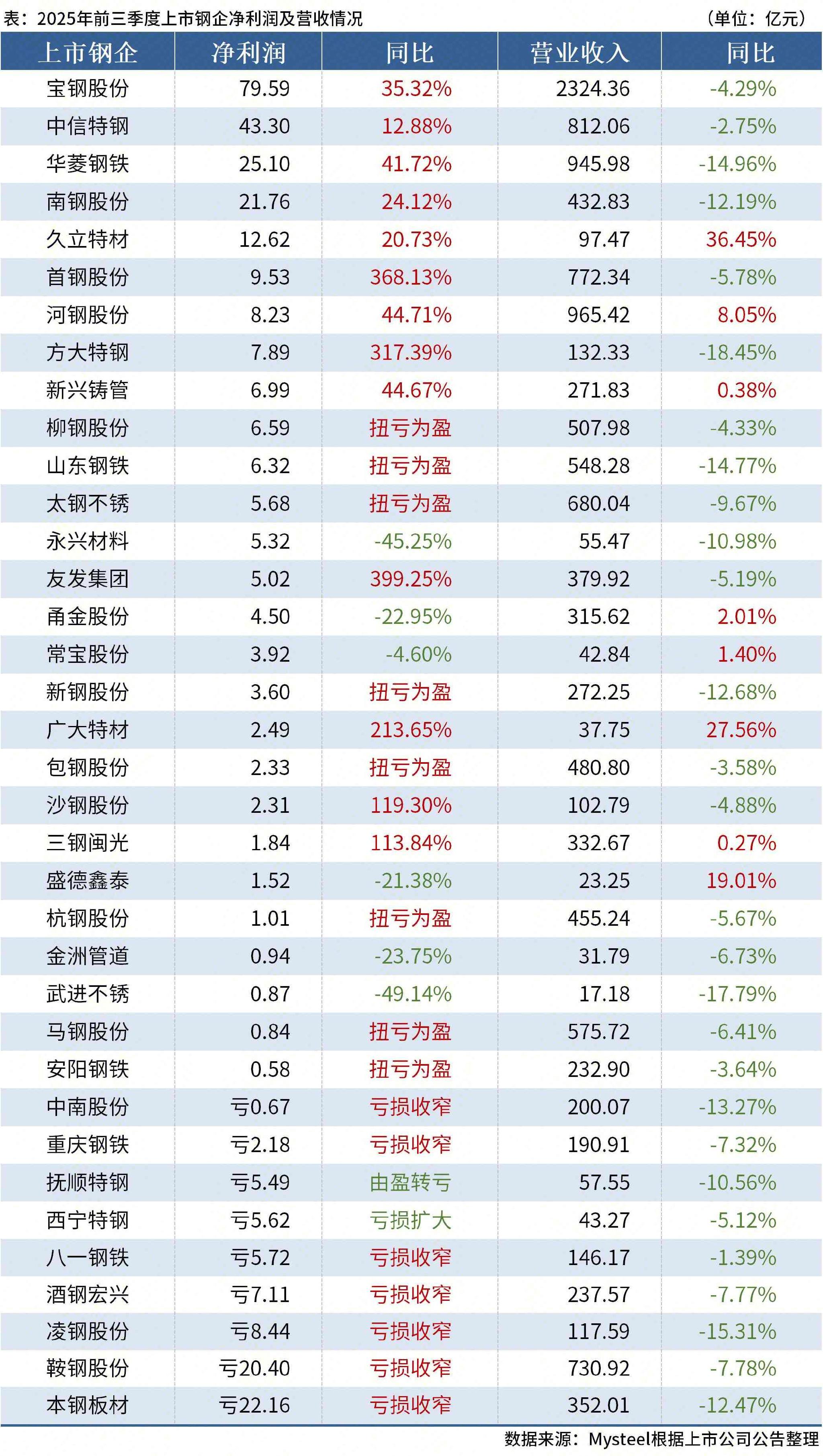 据Mysteel统计,截至10月31日,36家上市钢企公布2025年前三季度业绩情况,合计营业收入13923.17亿元,合计净利润192.90亿元。