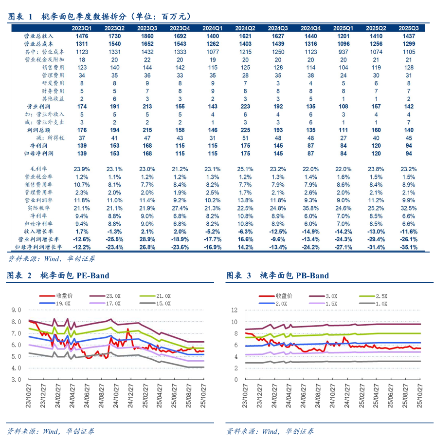 25Q3营收降幅略有收窄,华中延续领跑全国。分品类看,25Q3面包及糕点/其他食品分别实现营收13.6/0.8亿元,同比-8.9%/-41.4%,整体需求疲软背景下,以月饼为代表的其他产品降幅更大;分地区看,25Q3华北/东北/华东/华中/西南/西北/华南分别实现营收3.21/6.43/4.70/0.60/1.57/0.92/0.98亿元,分别同比-10.1%/-14.2%/-8.3%/+7.8%/-6.6%/-13.9%/-13.9%,受益于与量贩零食渠道合作顺畅,华中地区持续领跑全国。