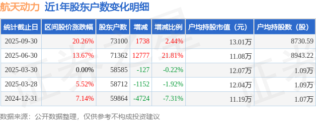 从股价来看,2025年6月30日至2025年9月30日,航天动力区间涨幅为20.26%,在此期间股东户数增加1738.0户,增幅为2.44%。