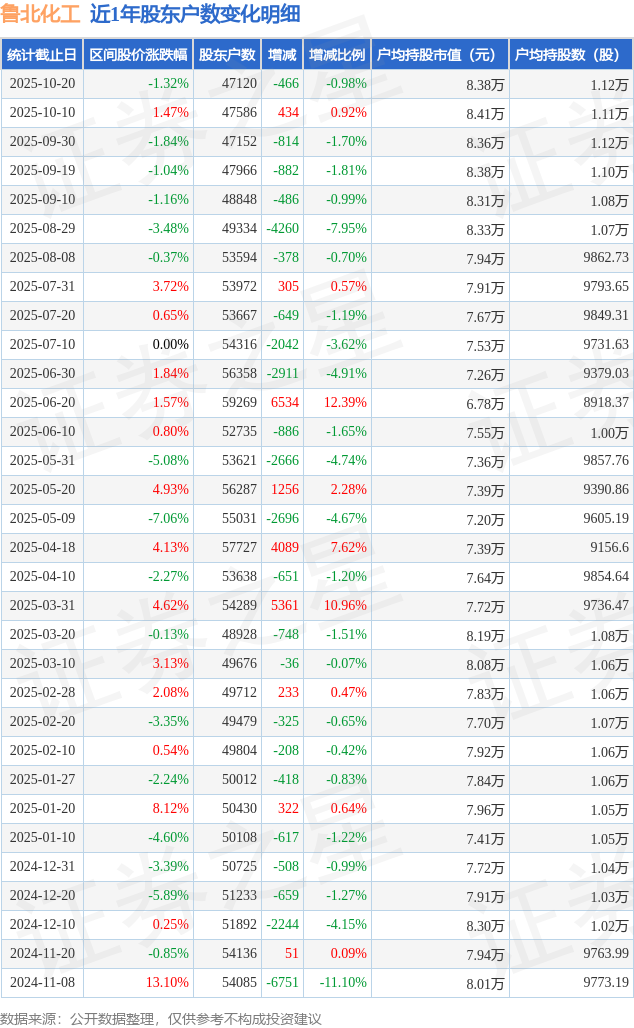 从股价来看,2025年10月10日至2025年10月20日,鲁北化工区间跌幅为1.32%,在此期间股东户数减少466.0户,减幅为0.98%。