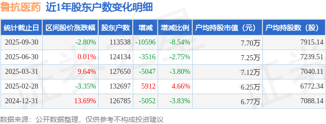 从股价来看,2025年6月30日至2025年9月30日,鲁抗医药区间跌幅为2.8%,在此期间股东户数减少1.06万户,减幅为8.54%。