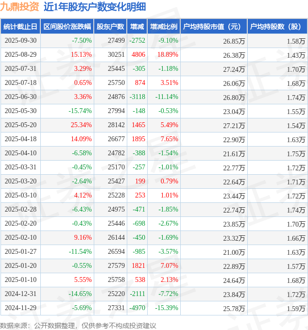 从股价来看,2025年8月29日至2025年9月30日,九鼎投资区间跌幅为7.5%,在此期间股东户数减少2752.0户,减幅为9.1%。