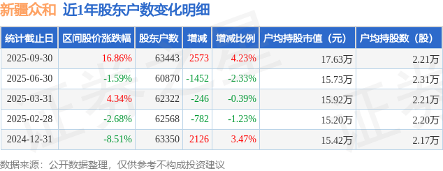 从股价来看,2025年6月30日至2025年9月30日,新疆众和区间涨幅为16.86%,在此期间股东户数增加2573.0户,增幅为4.23%。
