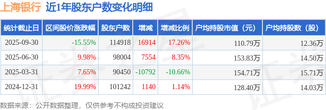 从股价来看,2025年6月30日至2025年9月30日,上海银行区间跌幅为15.55%,在此期间股东户数增加1.69万户,增幅为17.26%。