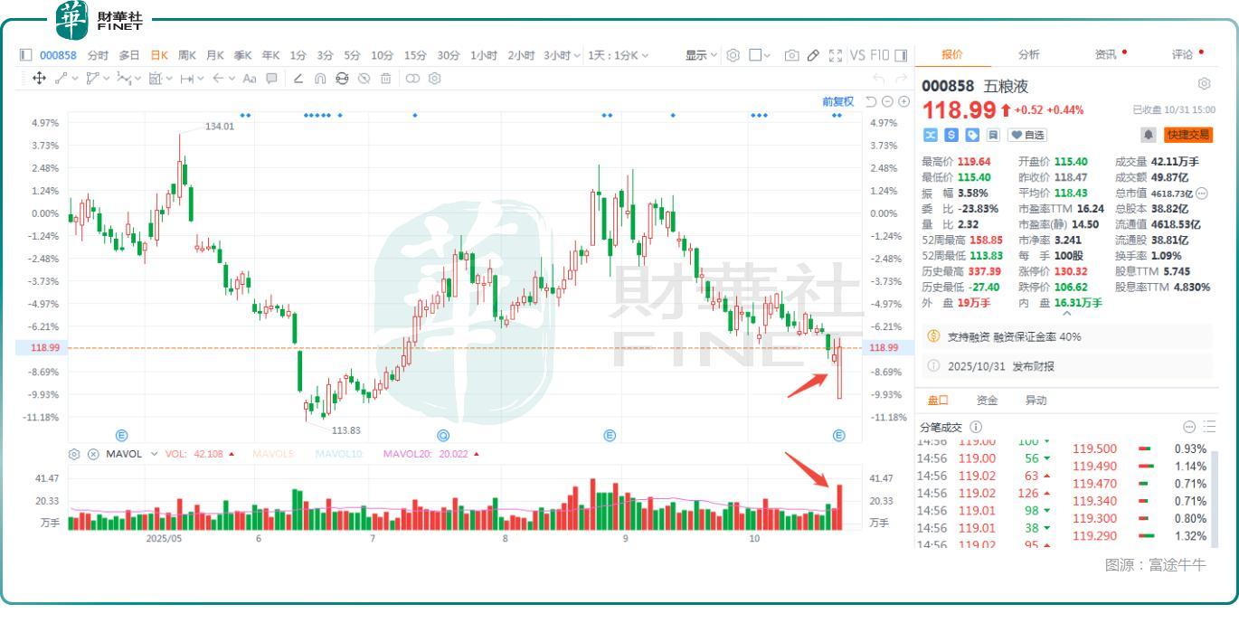 其中,在五粮液披露“暴雷”业绩后,其股价在低开2.6%的情况下,迅速上攻,最终放量收涨0.44%,显得比较强势。