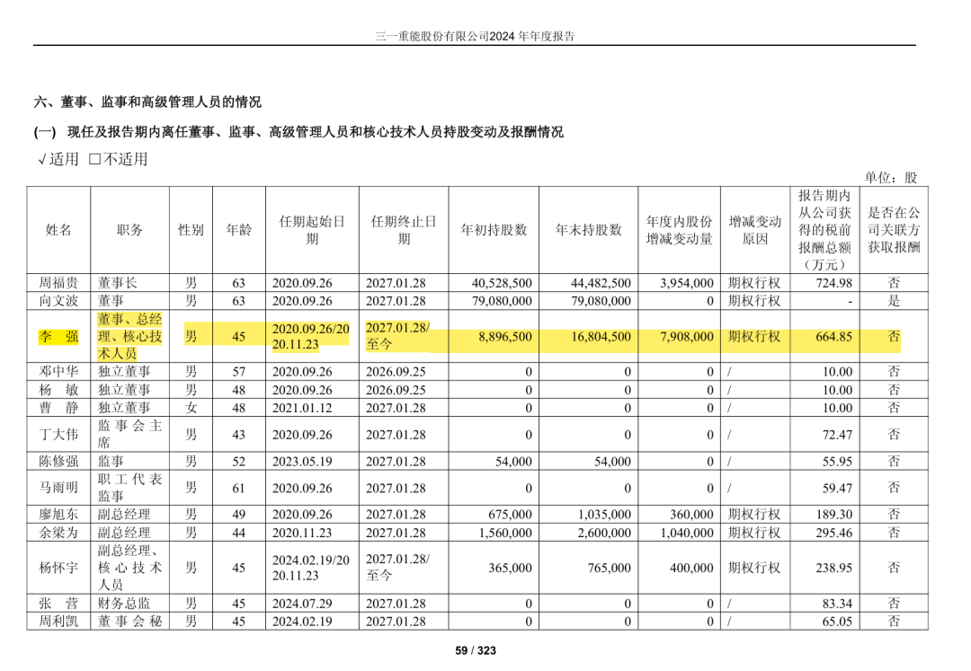 李强先生,男,1980年9月生,中国国籍,无境外永久居留权,毕业于中国矿业大学机械工程及自动化专业、浙江大学机械工程专业,博士学历。2008年9月至2012年1月,就职于通用电气(中国)全球研究开发中心有限公司,任研发工程师;2012年4月至2018年6月,就职于国电联合动力技术有限公司,任技术中心总工程师;2018年9月至2020年9月,任三一重能研究院院长、总工程师;2020年9月至2022年8月,任三一重能董事、副总经理、总工程师、研究院院长;2022年8月至2023年4月,任三一重能董事、总经理、总工程师、研究院院长;2023年4月至今,任三一重能董事、总经理、总工程师。