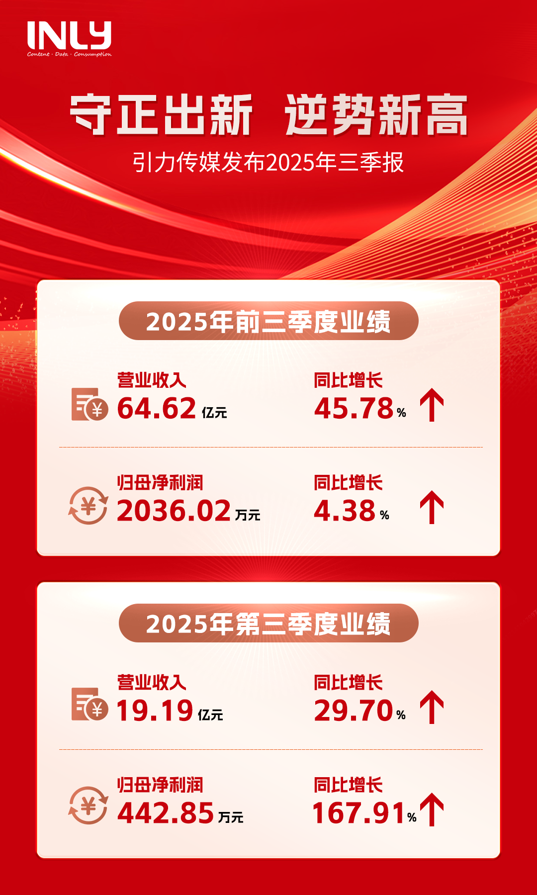 2025年10月30日,引力传媒披露2025年三季度业绩报告。2025年前三季度,引力传媒实现收入64.62亿元,同比增长45.78%;实现归属于上市公司股东的净利润2036.02万元,同比增长4.38%。公司在2025年第三季度实现收入19.19亿元,同比增长29.70%;实现归属于上市公司股东的净利润442.85万元,同比增长167.91%。