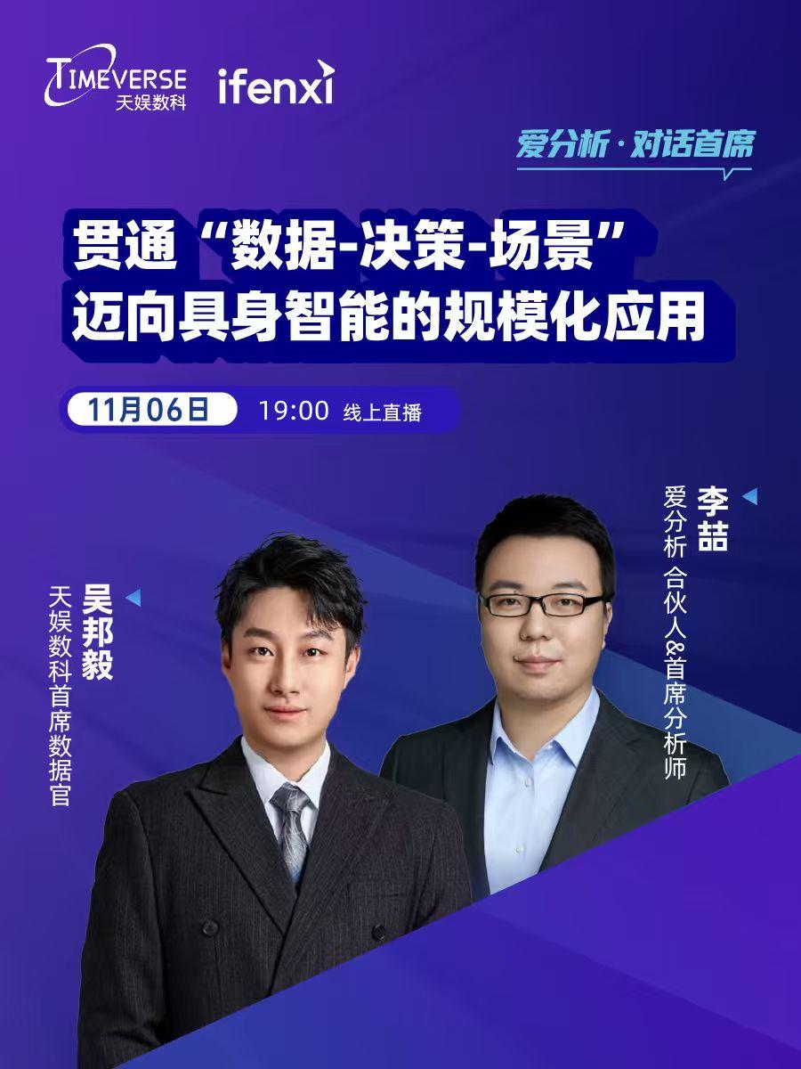 11月6日,天娱数科首席数据官吴邦毅博士,受邀参与深度聚焦数智化战略与商业实践的《对话首席》栏目,与合伙人兼首席分析师李喆先生展开深度对谈。双方将围绕“具身智能”如何跨越技术门槛,在真实场景中实现规模化应用这一核心议题,分享兼具前瞻视野与实践经验的独到见解。