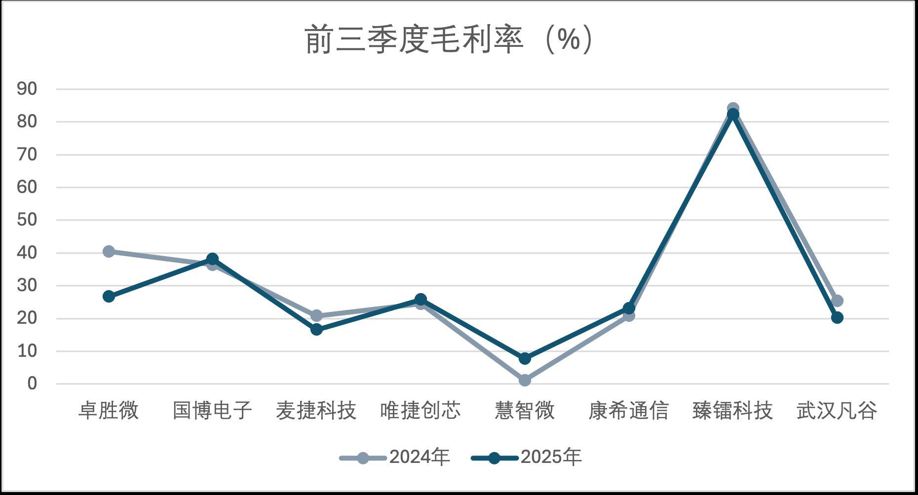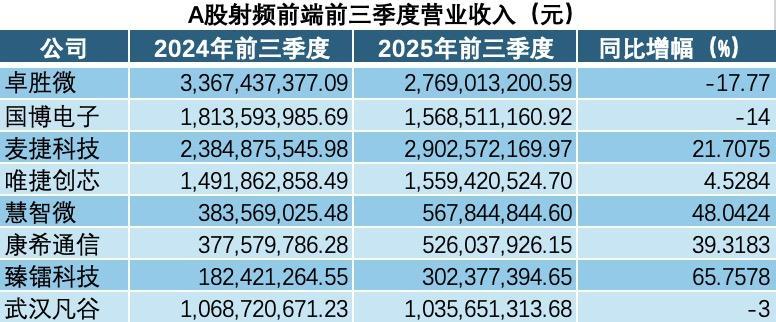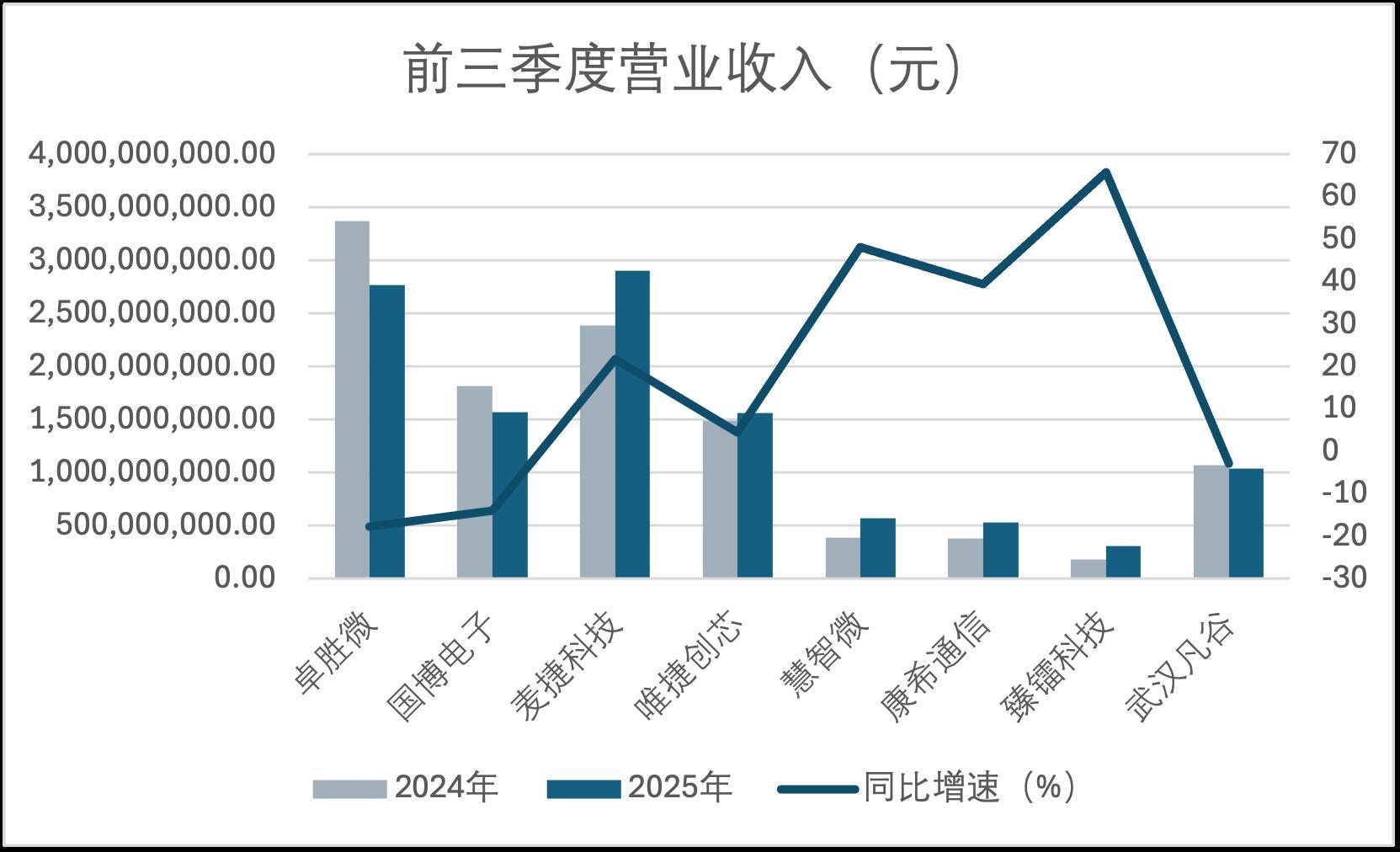 也有部分企业营收出现下滑。卓胜微前三季度营收为27.69亿元,较2024年前三季度的33.67亿元下降了18%。从季度表现来看,卓胜微第一季度营收为7.56亿元,同比下滑36.47%;第二季度营收增长至9.48亿元,同比降幅收窄至13.4%,同时环比实现25.40%的增长;第三季度营收增长到10.65亿元,同比降幅进一步收窄到1.62%,环比增长12.34%。从数据变化趋势可见,卓胜微前三个季度的营收呈现同比降幅显著收窄,环比持续增长的态势。国博电子营收从18.14亿元降至15.69亿元,降幅为13.51%。不过本季度,公司与国内头部终端厂商共同研发的硅基氮化镓功率放大器芯片(以下简称“功放芯片”),在手机等终端中成功量产应用,累计交付数量超100万只。国博电子预计公司新产品将持续对现有砷化镓终端功放产品形成替代,并有望在终端射频功放领域全频段、全场景推广应用,该产品系列有望为公司营收提供第二增长曲线。