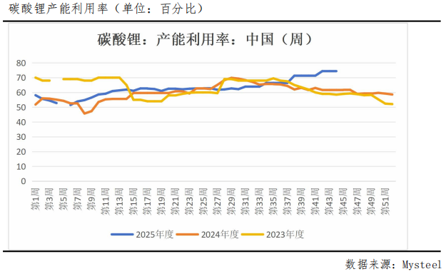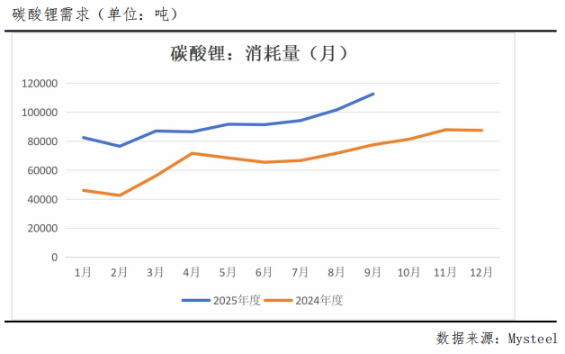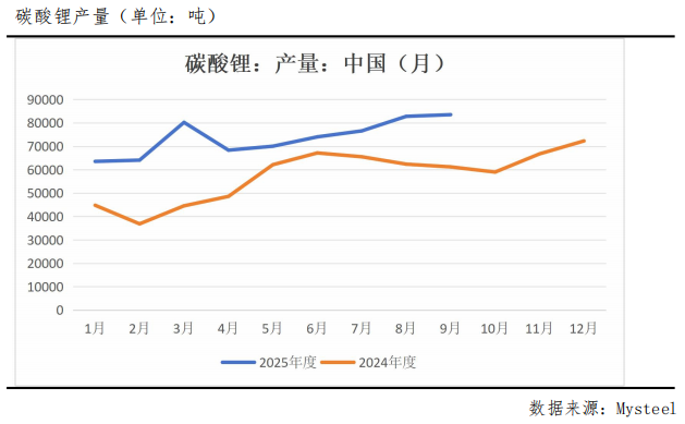 锂盐行业整体维持高开工率运行态势,当前产能利用率已接近75%,处于近三年来的绝对高位。碳酸锂产量持续处于较高水平,据Mysteel最新统计数据显示,9月份碳酸锂产量达到83500吨,尽管环比增幅有限,但同比大幅增长36.46%。基于持续走高的产能利用率判断,预计10月碳酸锂产量仍将延续攀升趋势。此外,宁德时代枧下窝矿区复产预期逐步升温,进一步加剧供应端压力,碳酸锂价格面临的供应端压制依然显著。