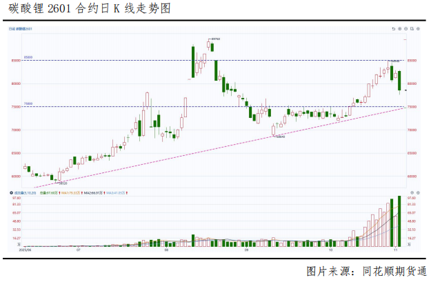 碳酸锂主力合约放量大跌,截至11月4日下午收盘,碳酸锂2601收盘报价78560元/吨,较前一交易日结算价下跌3560元/吨,跌幅4.34%,那么是什么原因导致盘面突然大幅回落的呢?是回调还是反转?