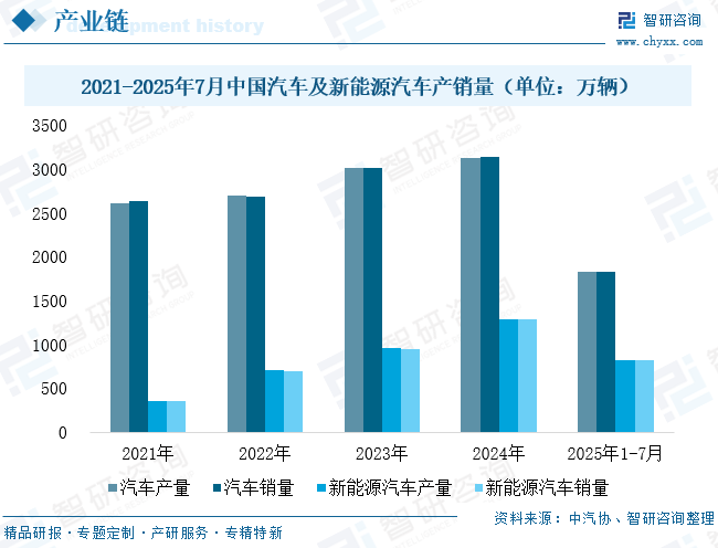 自2021年以来,国家和地方政府积极出台促进汽车消费的相关政策,加上各地相继推出的多种形式的促销活动,我国汽车产销规模稳定增长。数据显示:2025年1-7月,汽车产销分别完成1823.5万辆和1826.9万辆,同比分别增长12.7%和12%。新能源汽车凭借技术迭代与消费升级的双重驱动,其单车照明系统价值较传统燃油车提升30%-50%,成为产业链价值跃升的关键环节。2024年全球新能源车销量达到1629万辆,同比增长25%,其中中国市场占比高达67%,成为全球最大的新能源汽车市场。2025年1-7月新能源汽车产销量分别完成823.2万辆和822万辆,同比激增39.2%和38.5%,市场渗透率攀升至45%。在这场由电动化与智能化双轮驱动的产业变革中,LED车灯行业正突破传统功能边界,向“智能交互+美学设计”的融合形态加速演进,其作为汽车智能化“视觉窗口”的战略价值日益凸显,为产业链上下游开辟出巨大的增量市场。