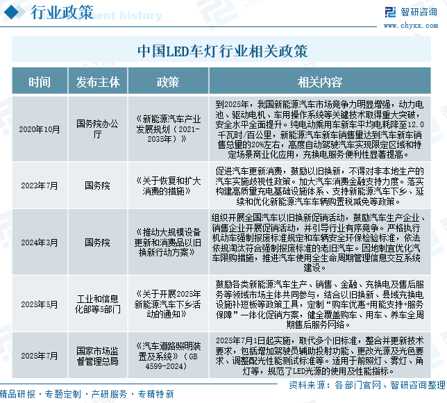 LED车灯作为汽车智能化与电动化转型的核心零部件,正迎来政策与标准双重驱动的黄金发展期。近年来,我国陆续出台《新能源汽车产业发展规划(2021-2035年)》《关于恢复和扩大消费的措施》《推动大规模设备更新和消费品以旧换新行动方案》《关于开展2025年新能源汽车下乡活动的通知》等政策,形成“技术引导+需求拉动+场景渗透”的政策组合拳,推动LED车灯市场升级。在标准方面,GB 4599-2024《汽车道路照明装置及系统》整合了原有灯丝灯泡、气体放电、LED前照灯等标准,2025年7月1日起实施,要求重新试验部分灯具(如灯丝灯泡前照灯、LED前照灯等),其他灯具直接换版。这一系列政策与标准的协同发力,为LED车灯市场创新与发展提供关键支撑。