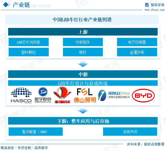 中国LED车灯产业链结构清晰且协同紧密:上游为核心元器件供应,包括LED芯片(如三安光电)、光学组件、驱动IC等,高端芯片仍部分依赖进口;中游为产业核心,涵盖车灯设计、模组制造与总成(代表企业如星宇股份、华域视觉),技术正向智能化(ADB/DLP)升级;下游为应用端,主要面向整车前装市场(如比亚迪、吉利等新能源车企)及汽车后市场,由新能源汽车普及和智能驾驶需求驱动,推动产业链持续创新与成本优化。