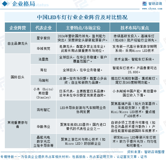 从企业布局看,国内星宇股份凭借新能源客户深度绑定和领先的ADB技术实现2024年营收登顶,华域视觉保持重要地位,而欧系巨头(法雷奥、海拉)稳健投资、日系厂商(小糸、斯坦雷)则呈现战略收缩态势。行业竞争正从传统照明向智能化(ADB/DLP)、数字化(Micro LED)和集成化(灯光域控制器)快速演进,在新能源汽车爆发和自主品牌崛起的双轮驱动下,市场份额持续向头部企业集中,呈现出“自主崛起、技术为王”的鲜明特征。