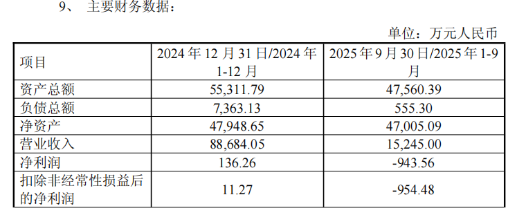 公告显示,标的公司注册资本6.16亿人民币,2024年末资产总额5.53亿、净资产4.79亿,营业收入8.87亿,净利润136.26万;2025年9月末资产总额4.76亿、净资产4.7亿,净利润-943.56万。