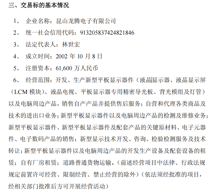 龙腾光电表示,本次交易事项在产权交易机构进行信息预披露,不构成交易行为,交易对方、交易方式、交易价格等相关事项目前尚不确定。