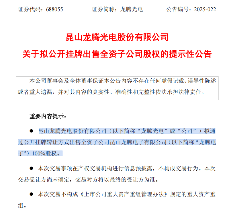 龙腾光电11月4日公告,因应公司全球战略发展规划,优化资源配置并推进新质生产力领域布局,提高整体运营效率,公司拟通过公开挂牌转让方式出售全资子公司龙腾电子100%股权。