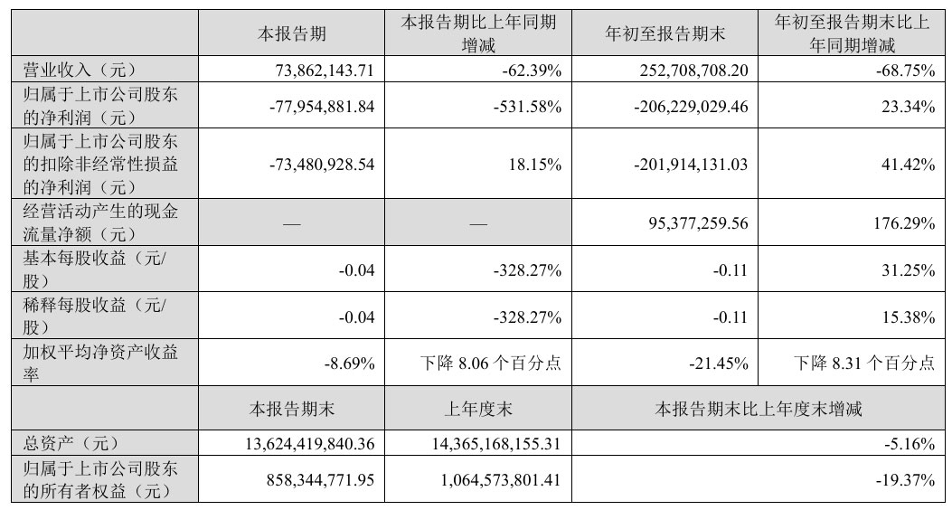 上礼拜五,他们刚刚公开了三季报。今年1-9月,公司实现营业总收入2.53亿元,同比下降了68.75%,归母净利润也亏损2.06亿元。