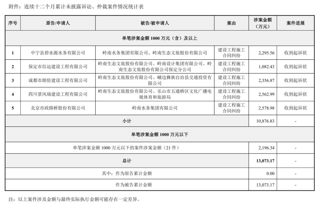 值得注意的是,这1.31亿元诉讼和仲裁事项中,岭南股份全部是作为被告,占比100%。