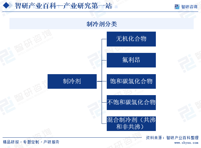 制冷剂,又称冷媒、雪种,是各种热机中借以完成能量转化的媒介物质,其基本原理是在系统的各个部间循环流动以实现能量的转换和传递,使得制冷机从低温热源吸热,向高温热源放热,从而实现制冷的目的。主要由氢氟酸及氯代烃等为原料制备,是氟化工行业内的最大产品。不同的应用场景,制冷剂的选择也大不相同,目前使用的主要分为6大类,包括无机化合物、氟利昂、饱和碳氢化合物、不饱和碳氢化合物、混合制冷剂(共沸和非共沸)。