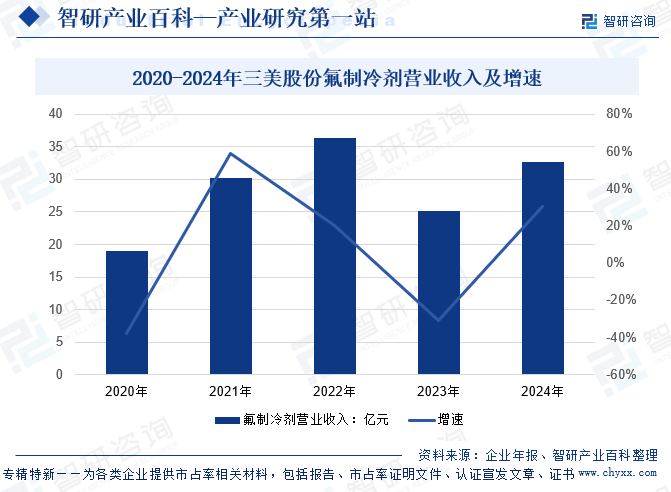 浙江三美化工股份有限公司主要从事氟碳化学品和无机氟产品等氟化工产品的研发、生产和销售。公司氟碳化学品主要包括氟制冷剂和氟发泡剂,其中氟制冷剂主要包括HCFCs类制冷剂(HCFC-22、HCFC-142b)、HFCs 类制冷剂(HFC-134a、HFC-125、HFC-143a、HFC-32,以及混配制冷剂R410A、R404A、R407C、R507 等),丰富的产品组合能够满足客户对氟制冷剂的多样化需求。2024年公司氟制冷剂实现营业收入32.68亿元,同比上涨30.28%。
