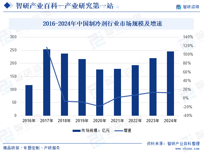 随着全球气温升高,尤其是夏季炎热天气愈加常见,制冷设备的需求显著增加。无论是家居、商业空间还是工业领域,对制冷设备的需求都在快速增长,这直接推动了制冷剂市场的扩大。数据显示,2016年中国制冷剂行业市场规模为117.2亿元,到了2024年行业市场规模增长至245.5亿元。预计未来随着制冷设备的更新换代,海外市场的进一步拓展,中国制冷剂行业市场规模将继续保持增长态势。
