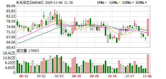 11月6日盘中科创板股长光华芯涨停,截至10:49,股价报80.27元,成交12.26亿元,换手率9.24%,振幅17.90%。