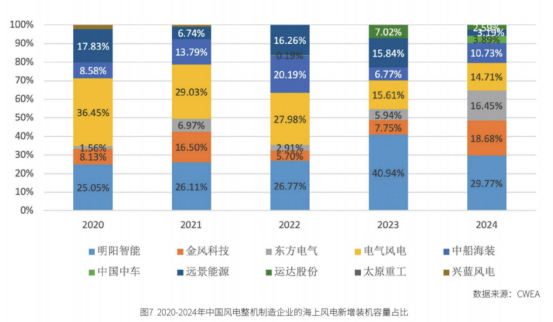 今年10月,伴随16MW漂浮式风电机组吊装完成,金风科技在宣传视频结尾用“入深海,见未来”收尾,明确其深耕深远海风电市场的发展目标。其海上风电市占率持续增长,深远海为关键未来赛道。